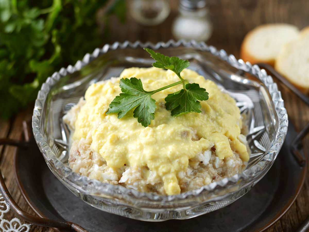Отдельная часть рецепта — ароматный соус: желтки смешать с горчицей и уксусом, затем соединить до гладкости. Небольшая щепоть соли помогает подчеркнуть вкус и держит композицию вместе.