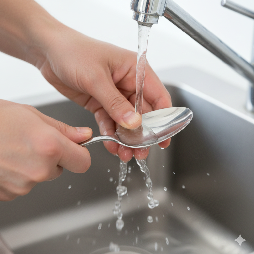 В магазинах продают специальные бруски «стального мыла», но обычная ложка из кухонного ящика действует ничем не хуже и ничего не стоит. Для безопасности избегайте интенсивного трения о острые предметы и не используйте горячую воду — холодная делает трюк более эффективным.
