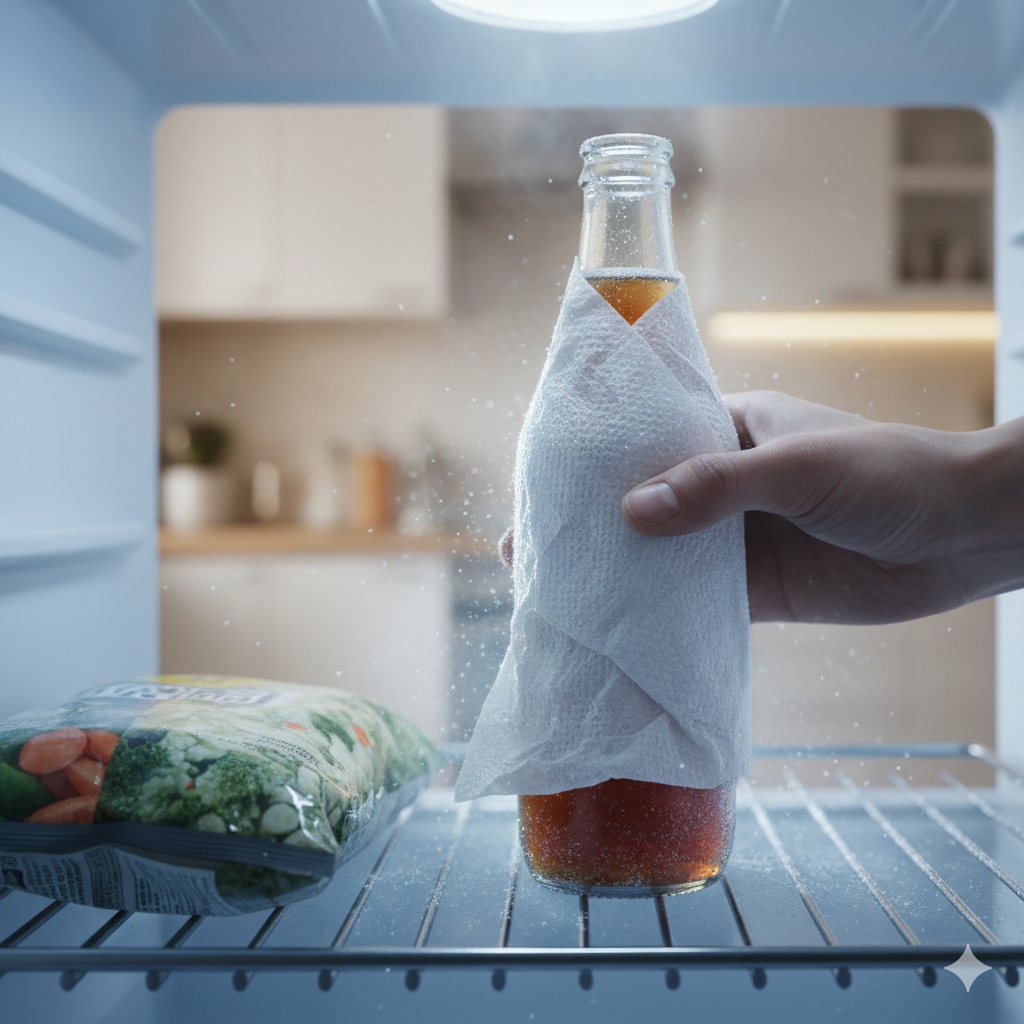 Почему данный метод так эффективен? Все дело в том, что теплая поверхность бутылки активирует испарение воды на салфетке. Этот процесс отбирает тепло у сосуда, способствуя его быстрому охлаждению. В морозильной камере, где действуют низкие температуры и ускоренная циркуляция воздуха, этот эффект усиливается, позволяя вашему напитку мгновенно охлаждаться.