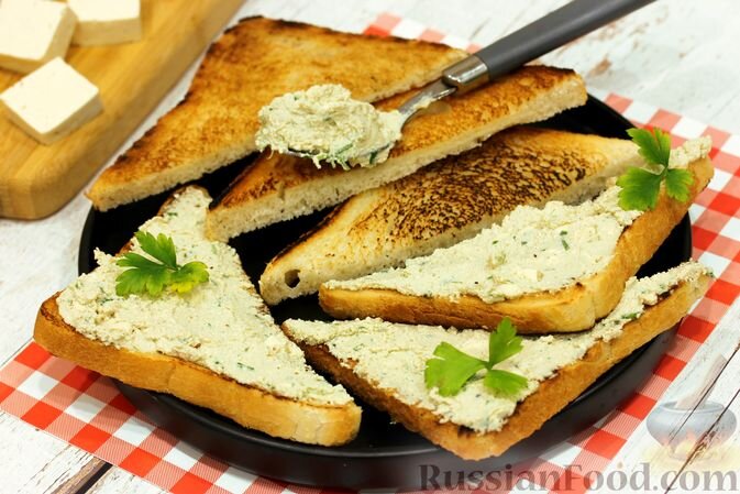 - Тосты с намазкой из тофу. Этот необычный вариант пасты на основе соевого сыра добавит вашему завтраку новых вкусовых оттенков. В сочетании с тертой зеленью и соевым соусом он станет оригинальной закуской.