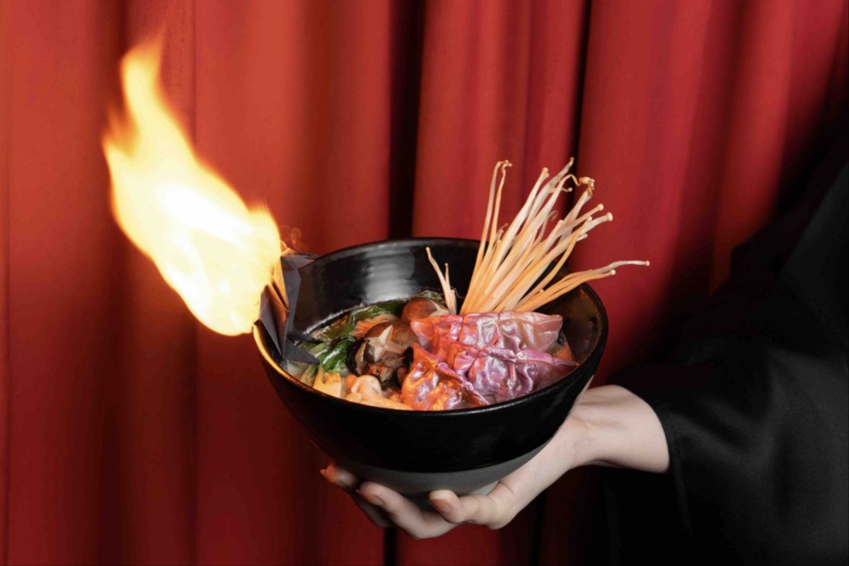 Особую нотку этому рамену придают перламутровые фиолетовые гедза с куриным фаршем, которые гармонично дополняют грибной бульон. В качестве впечатляющего акцента подача украшена черным ворон-оригами, который поджигается прямо на столе, создавая завораживающее зрелище, пишет Дзен-канал "FOODISCOVERY".