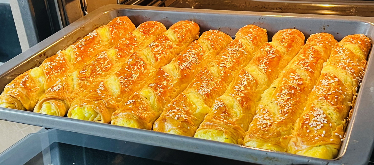 Каждый слой теста вытягивается тонко, после чего начинка выкладывается с одного края. Заворачивать тесто следует в рулет, который затем помещается на противень. Перед выпечкой поверхность смазывается молоком или желтком для получения золотистой корочки.
