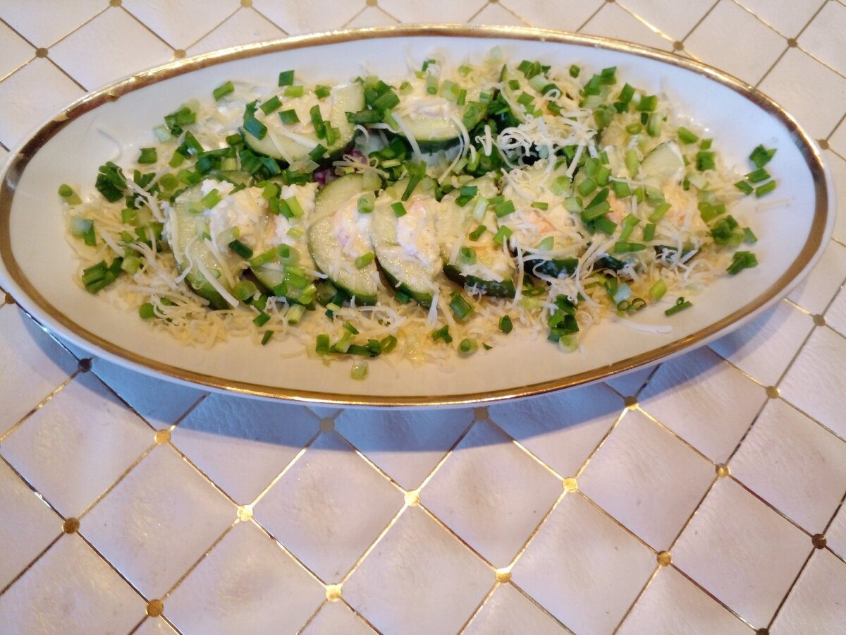 Следующий шаг: аккуратно распределить смесь из сыра, яйца и заправки. Наконец, огурцы нарезаются ровными полуколечками и посыпаются оставшимся сыром и зеленью.