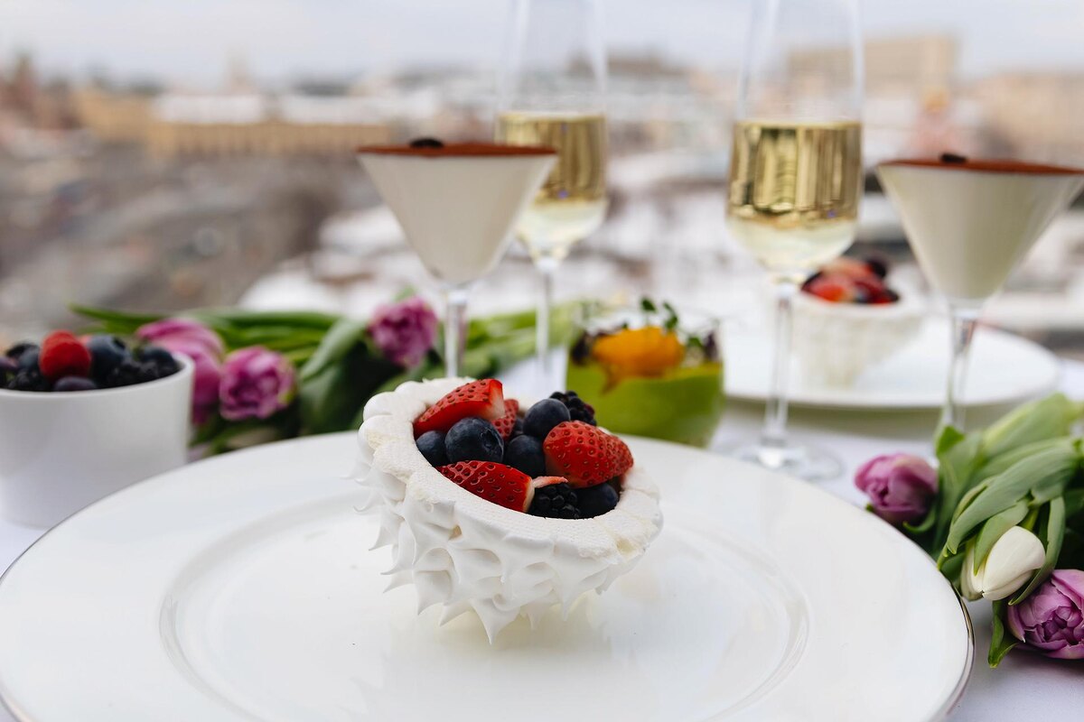 Ресторан предлагает бранч в формате шведского стола с разнообразными блюдами и уникальными десертами. Шеф-повар Андрей Кагокин демонстрирует более 100 позиций, среди которых есть опции для вегетарианцев и соблюдающих пост.
