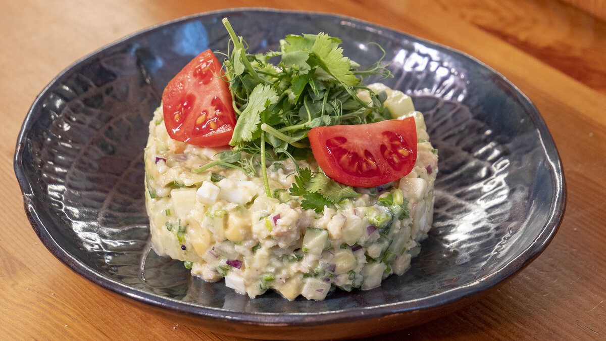 Перемешиваем салат с заправкой и аккуратно формируем его при помощи сервировочного кольца на тарелке, прижимая сверху ложкой. Для украшения используем стебли кинзы, микрозелень и кусочки томата.