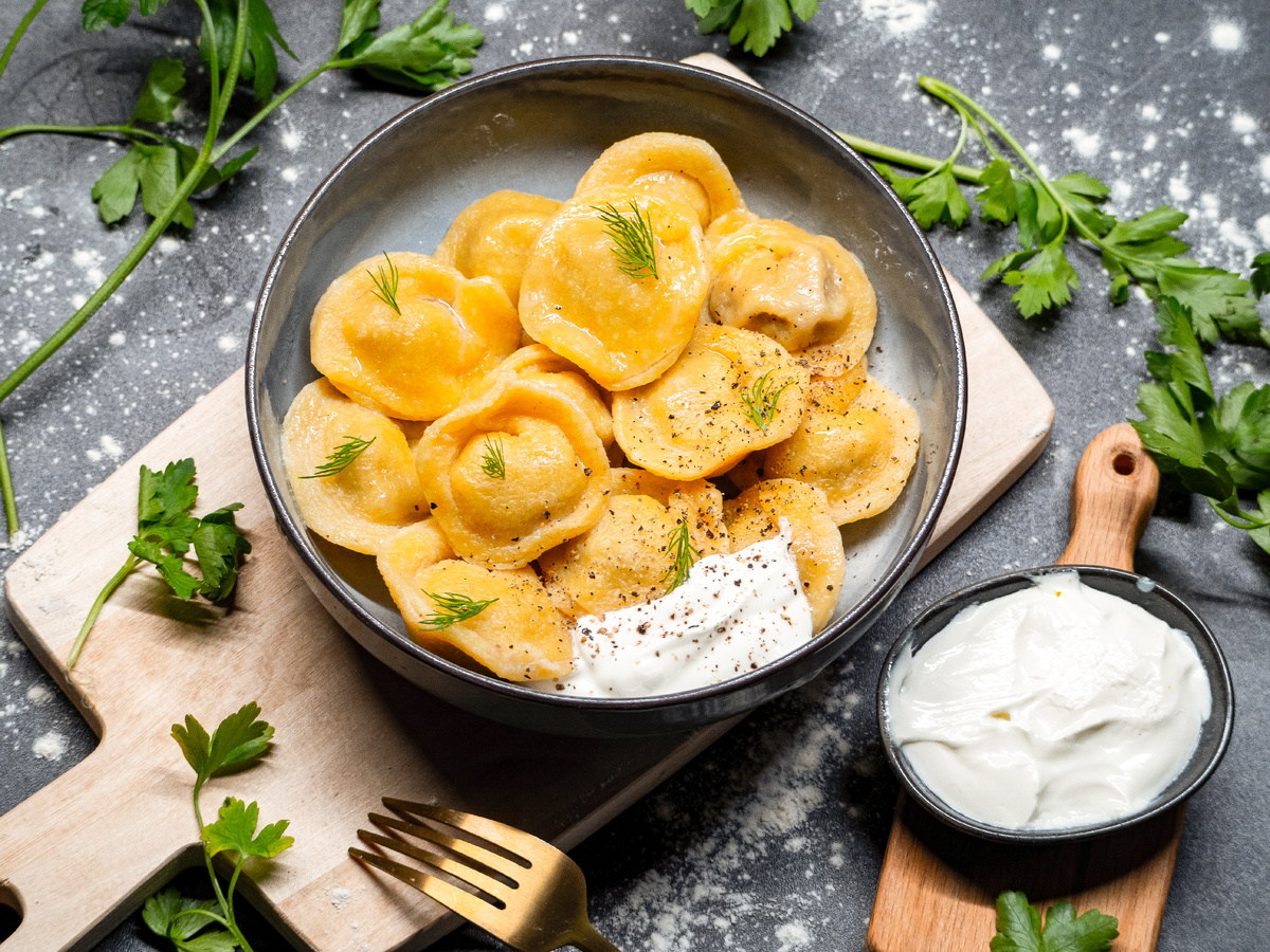 Начать стоит с того, чтобы смешать муку с манной крупой и добавить яйца. Замесить тесто до гладкости, а затем убрать в холодильник примерно на 40 минут – это сделает его более эластичным. Далее фарш соединяется с мелко нарезанным луком, перцем и солью, после чего его нужно хорошенько вымесить и «отбить», чтобы он стал плотным. Раскатайте тесто, вырежьте кружочки, наполните фаршем и тщательно защипните края. Вскипятите подсоленную воду с приправами и варите пельмени в течение 3 минут после их всплытия. Подавайте с домашней сметаной и свежим укропом.