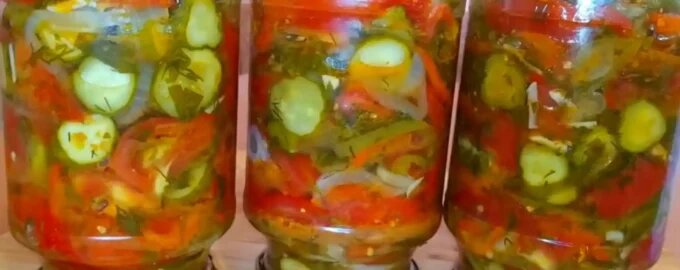Представляем великолепный рецепт салата из помидоров и огурцов на зиму, который под названием «Лето в банке» удачно сохраняет свежий аромат лета несмотря на холодные зимние дни. Сочетание спелых помидорчиков, хрустящих огурцов, сладковатого болгарского перца, лука и зелени создает непревзойденный вкус, который станет отличной закуской или дополнением к любому гарниру в зимний период.