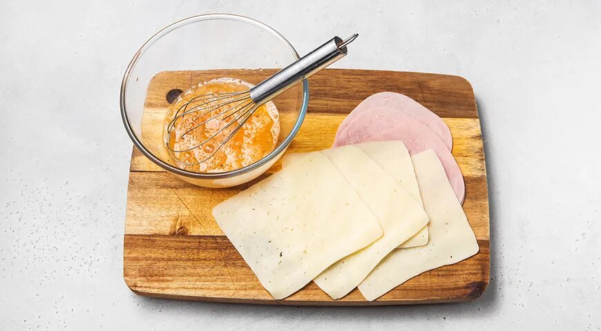 Начните с подготовки всех компонентов. Ветчину и сыр нарежьте ломтиками, соответствующими размеру хлеба. Яйца взбейте венчиком, добавив немного соли и перца для вкуса.
