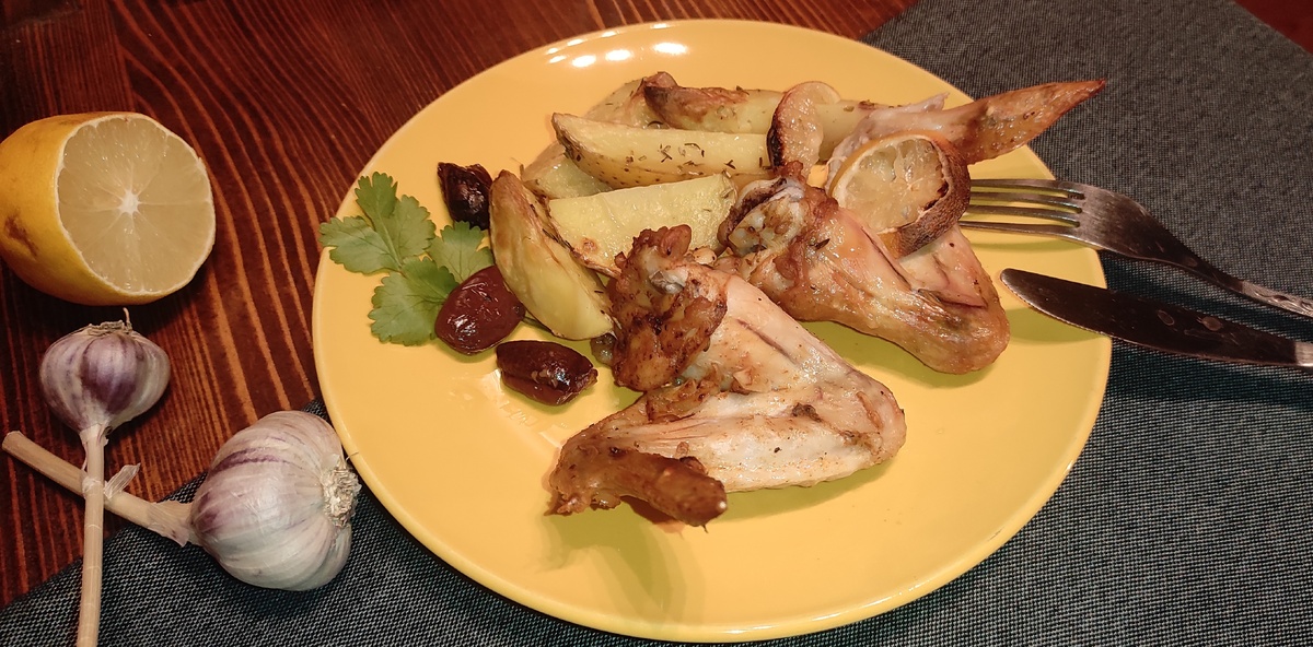 Курица посыпается красной молотой паприкой, добавляется рубленый чеснок, а также соль и перец. Затем кусочки курицы выкладываются на картофель, а между ними размещаются дольки лимона и оливки. Поместите противень в разогретую до 180°C духовку. Запекайте блюдо в течение 50 минут — 1 часа.
