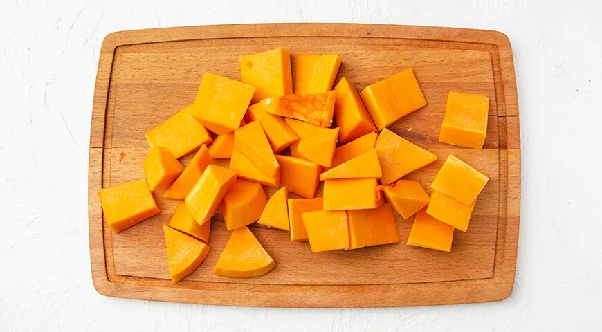 Прежде всего, необходимо подготовить тыкву. Разделите её пополам, удалите семена и нарежьте на куски размером около 3 на 4 сантиметра. Очищенную мякоть доведите до состояния, когда её можно будет легко сварить. Затем насыпьте в кастрюлю нарезанные кусочки тыквы и добавьте немного воды, чтобы она полностью их покрыла. Доведите до кипения, накройте крышкой и уменьшите огонь, варите в течение 10-15 минут.