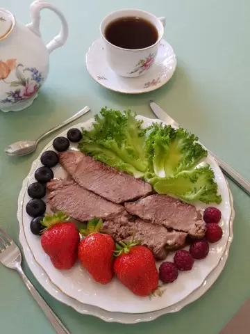 После завершения готовки говядину нарезать на кусочки и выкладывать по тарелкам, дополнив блюдо свежими листьями салата, а также ягодами: клубникой, малиной и голубикой. Это придаст не только яркость, но и удивительное сочетание вкусов. Приятного аппетита и прекрасных выходных!
