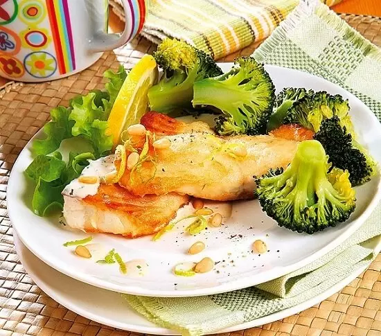 Обжарьте кусочки рыбы с обеих сторон в оставшемся растительном масле. После этого слейте воду с брокколи, сразу же разложите овощи и рыбу по тарелкам, полейте соусом и посыпьте кедровыми орешками.