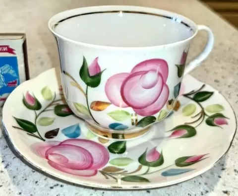 Артёмовский фарфоровый завод, находящийся в Приморском крае, существовал с 1964 по 2003 год и представил Борису две удивительные чайные пары и блюдце. Хотя подробностей о названии росписи не удаётся найти, на тарелках чётко видны "Розы - Агашки". Борис подчеркивает качество фарфора, выделяя его лёгкость и элегантность. "Отличное сочетание для подачи кофе и сладостей", — добавляет он.