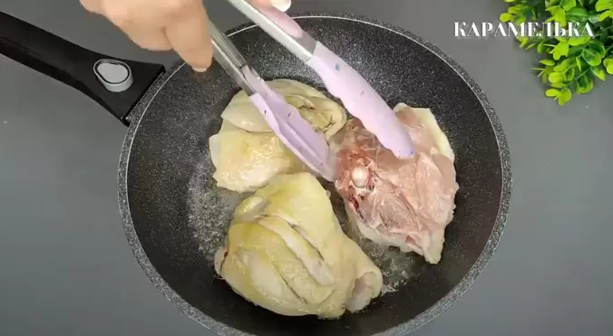 Сначала разогреть сковороду с растительным маслом и положить на нее бедрышки кожей вниз. Обжаривать их около 7-8 минут с каждой стороны, пока не появится румяная корочка. Мясо должно оставаться слегка розовым внутри.