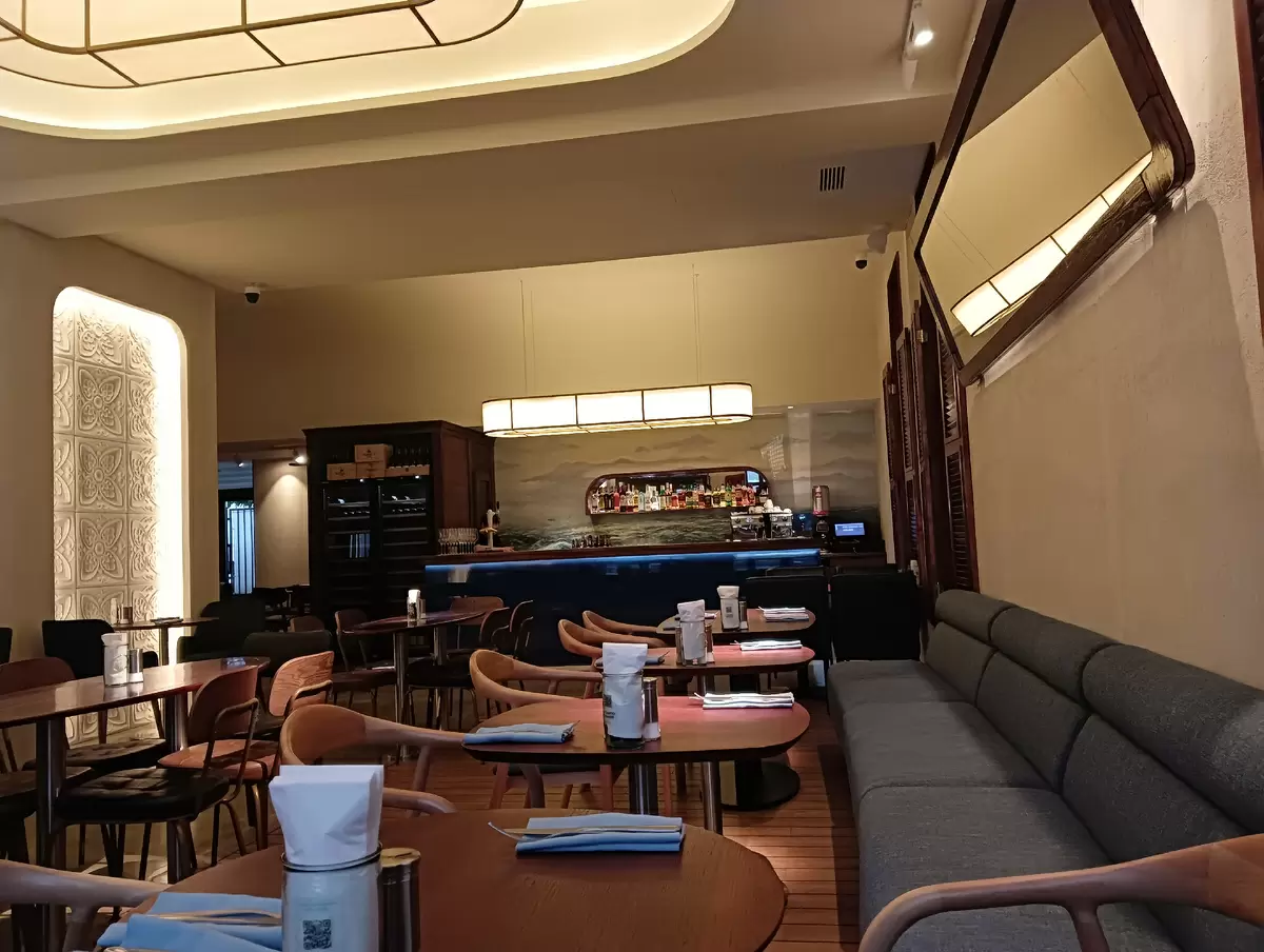 Вечер в Порто~Франко оказался необычайно спокойным, так как заведением владели только несколько посетителей. Интерьер, выполненный в яхтенном стиле с деревянными акцентами, сразу настраивает на расслабляющую атмосферу. Особое очарование придают красные кресла, расположенные у окна, где можно насладиться не только ужином, но и удивительным видом.