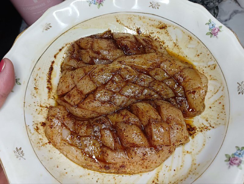 В отдельной миске готовится маринад: смешиваются соль, черный перец, паприка, хмели-сунели, измельченный чеснок, соевый соус и мед. Полученной смесью хорошо обмазывают филе и оставляют мариноваться.