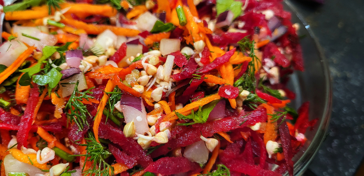 Смешайте все нарезанные ингредиенты, добавьте пророщенную гречку, приправьте солью, заправьте маслом и лимонным соком. Этот салат станет отличным вариантом для легкого ужина или закуски, полным витаминов и минералов, необходимых для поддержания энергии и здоровья.