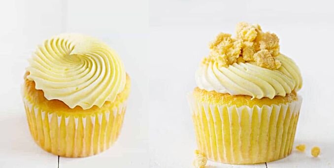 Для крема взбить масло с экстрактом лимона и молоком. Добавить сахарную пудру, регулируя консистенцию по необходимости. Затем крем перекладывают в кондитерский мешок и, используя насадку, украшают кексы крутящими движениями для создания шапочек.