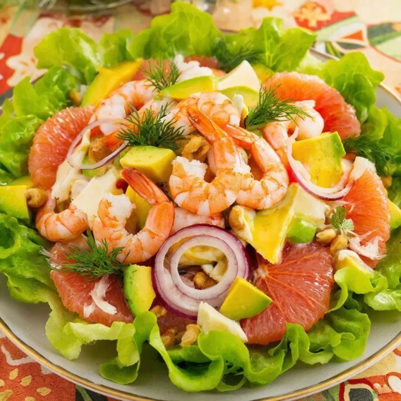 Этот салат является настоящим украшением любого праздничного стола. В нем гармонично переплетаются сладковатые нотки тигровых креветок, нежная текстура авокадо, освежающая кислинка грейпфрута и хрустящие акценты. Внешний вид блюда гарантированно привлечет внимание гостей.