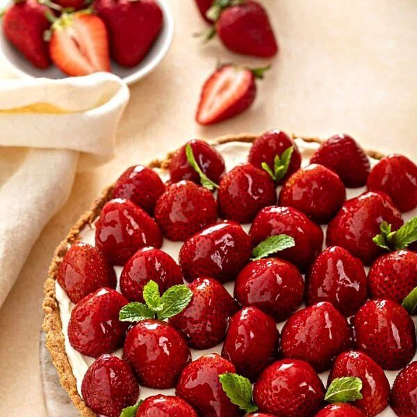 Этот элегантный пирог с хрустящей основой и кремовой начинкой из сливочного сыра просто поражает. Свежая летняя клубника придаёт нежность и сладость каждому кусочку.