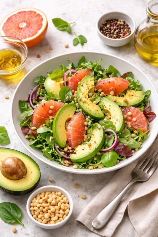 Шаг 4: Сборка. Выложите в тарелку салатные листья, добавьте авокадо и грейпфрут, полейте заправкой и по желанию посыпьте орехами или луком.
