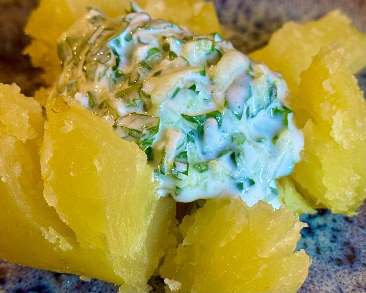 Отварной картофель с ароматным йогуртовым соусом — это идеальный вариант для быстрого и сытного завтрака. Естественно, он также подойдёт как легкая закуска в любое время дня.