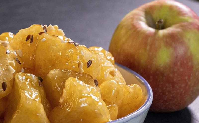 Секрет в процессе приготовления. Технология двойной обжарки обеспечивает идеальный баланс между хрустящей корочкой и нежной сердцевиной. Яблоки превращаются в настоящее вкусовое шоу благодаря глазури из яблочного сока и карамели, которая придаёт им уникальную насыщенность.