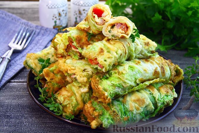 1. Рулетики из пекинской капусты с ветчиной и помидорами. Нежные листья капусты обжариваются в яичном кляре, а в качестве начинки используются ветчина, помидоры, зеленый лук и сыр. Это простая и сытная закуска, которая станет отличным дополнением к любому столу.