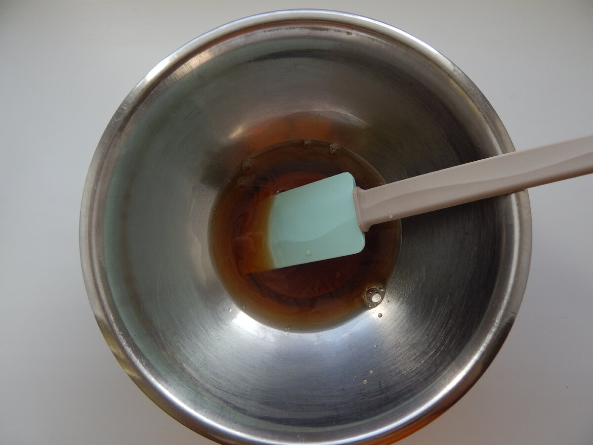 Следующим шагом вылейте получившийся полусироп в миску, добавьте соль, соду и специи. Перемешайте венчиком. Нормально, если на поверхности появится пена — это взаимодействие соды с мёдом. Затем влейте растительное масло и снова тщательно перемешайте.