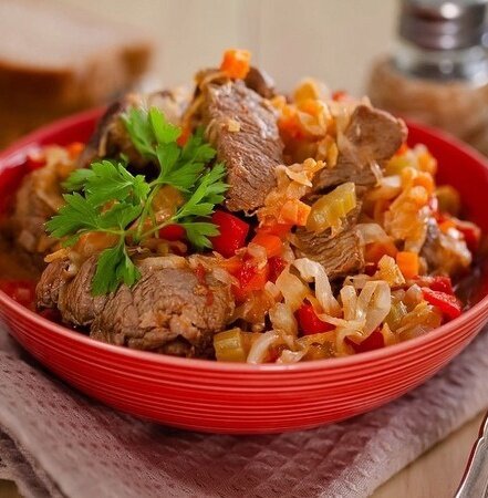 На следующем этапе вливаем стакан воды и доводим до кипения. После этого добавляем сладкий перец и нашинкованную капусту, продолжая тушить около 15 минут. В финале добавляем томаты в собственном соку, перемешиваем и оставляем рагу готовиться еще на 40 минут. Должно получиться ароматное, сытное блюдо, способное поднять настроение в любой день.