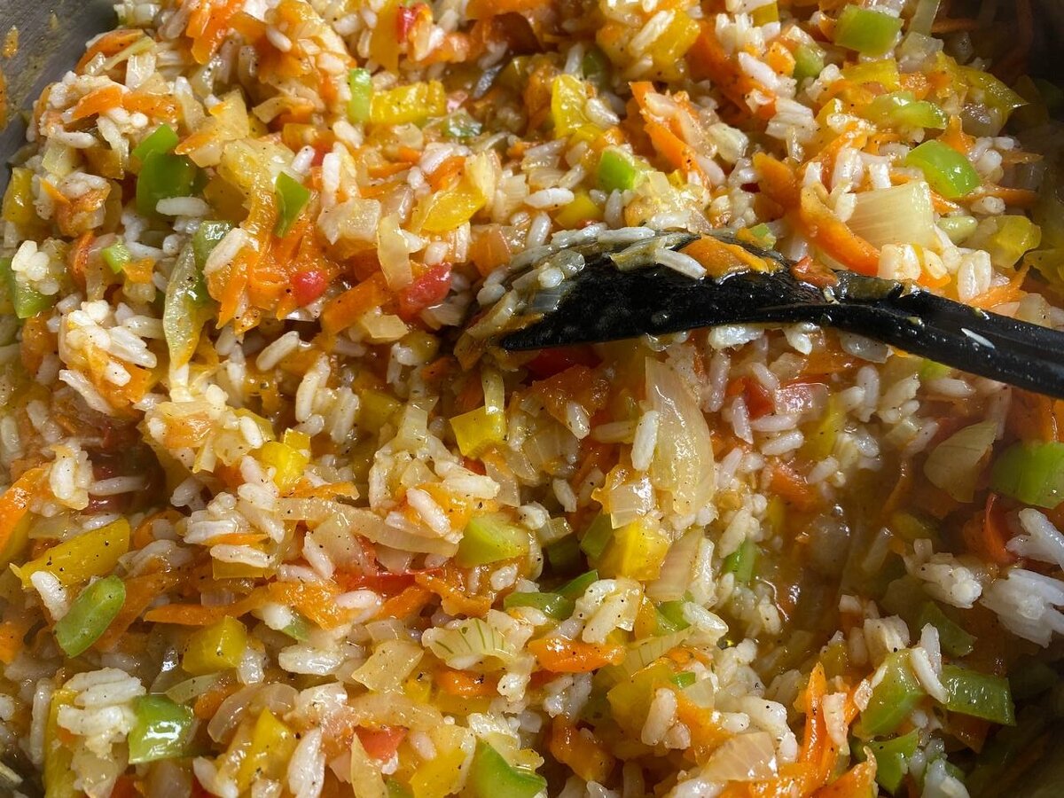 2. Пока рис варится, подготовьте овощи: мелко нарежьте лук, натрите морковь, а перец и помидоры - нарежьте кубиками.
