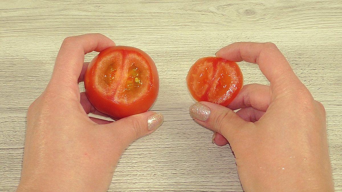 Сначала помидоры следует тщательно подготовить: отрезать верхушки и аккуратно извлечь мякоть, оставляя лишь стенки. Не выбрасывайте мякоть — ее можно заморозить и использовать позже в других блюдах.