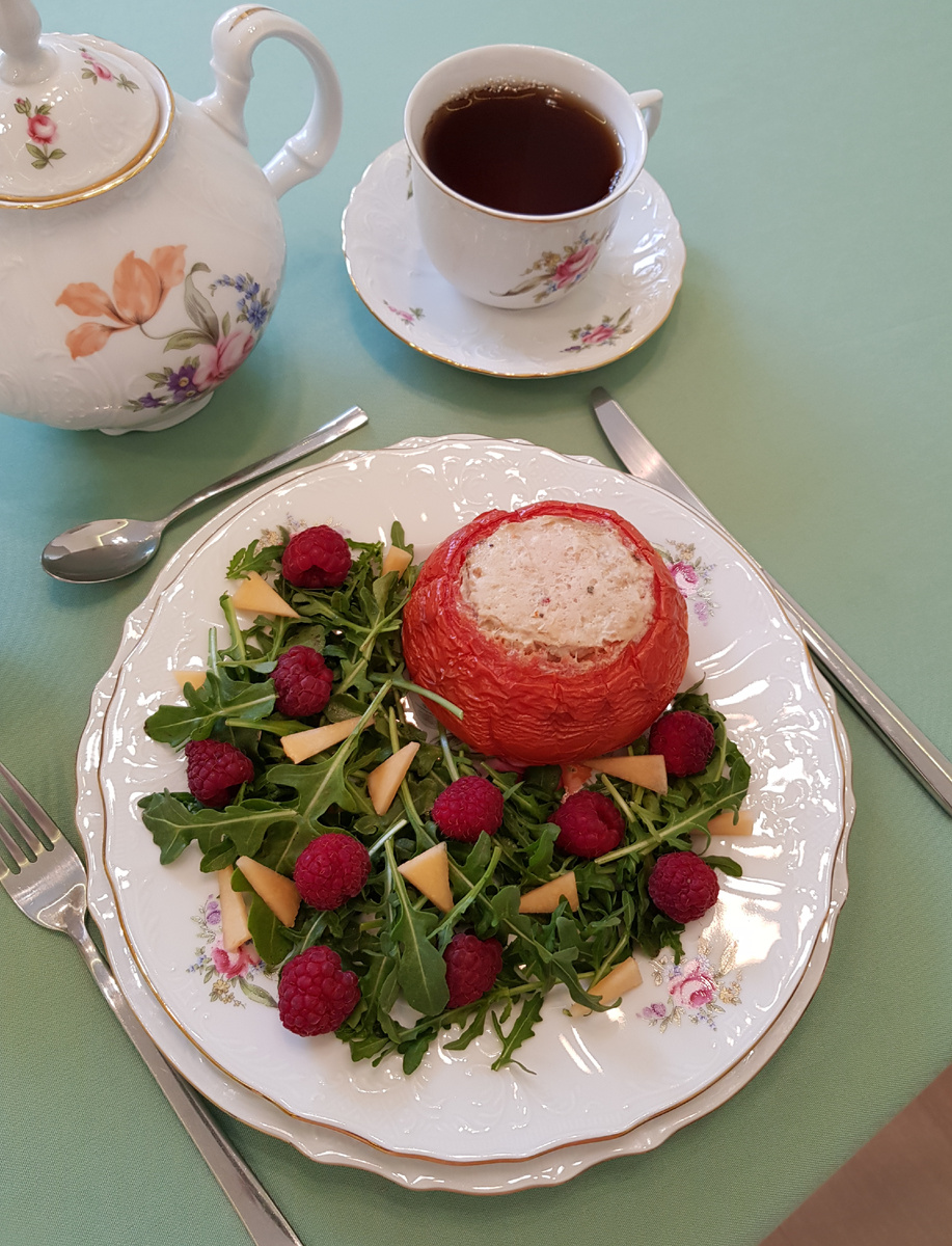 Готовые помидоры подаются на стол с легким салатом из дыни и малины, что придаст блюду свежести и яркости. Приятного аппетита!