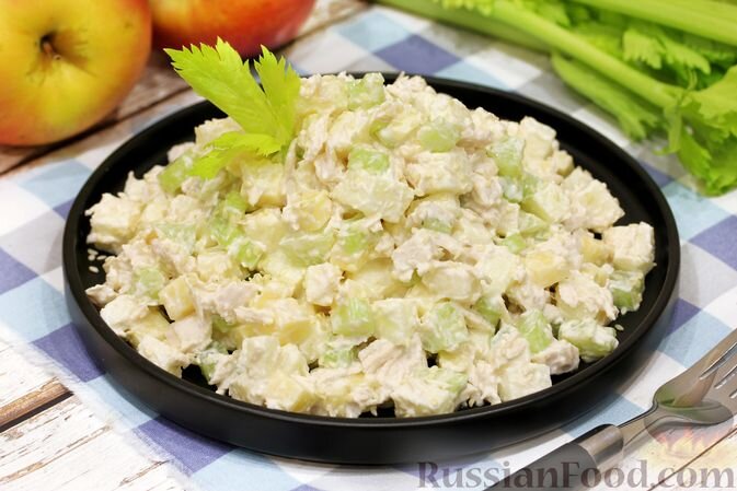 - Салат с курицей и яблоком: Нежное куриное филе, свежий сельдерей и сыр отлично гармонируют с хрустящим яблоком. Заправляется сметаной или натуральным йогуртом, это прекрасный способ утолить голод без вреда для фигуры.