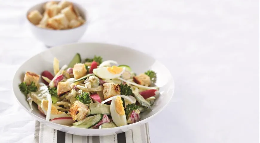 Летний салат в стиле Цезарь с русским акцентом — это свежий взгляд на знакомое блюдо, в котором традиционные составляющие Цезаря объединяются с характерными русскими продуктами. Это отличное решение для тех, кто любит кулинарные эксперименты и жаждет разнообразия на столе.