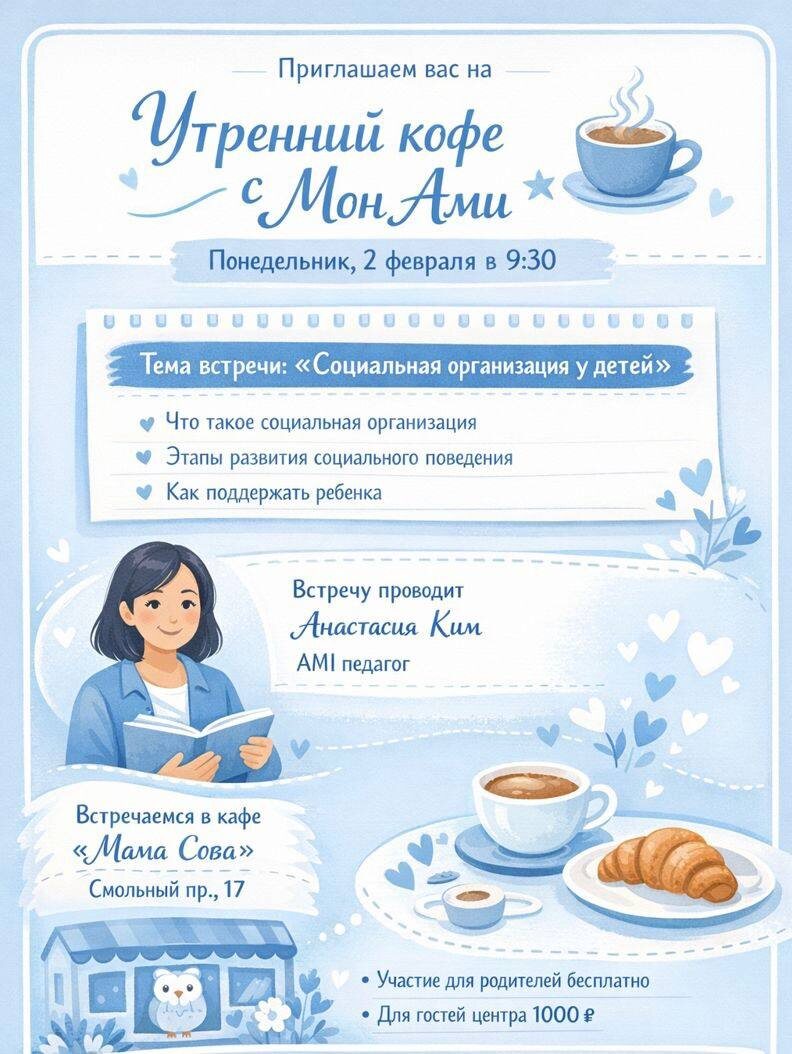 Продолжительность мероприятия составит 1,5 часа. Мы будем рады видеть всех в кафе «Мама Сова», расположенном на Смольном проспекте, 17.