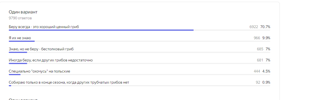 Наибольшее количество голосов собрал опрос, связанный с польскими грибами, который, кстати, набрал почти 10 тысяч ответов. Вопрос был задан в контексте статьи, исследующей загадку популярности этого гриба в разных регионах.