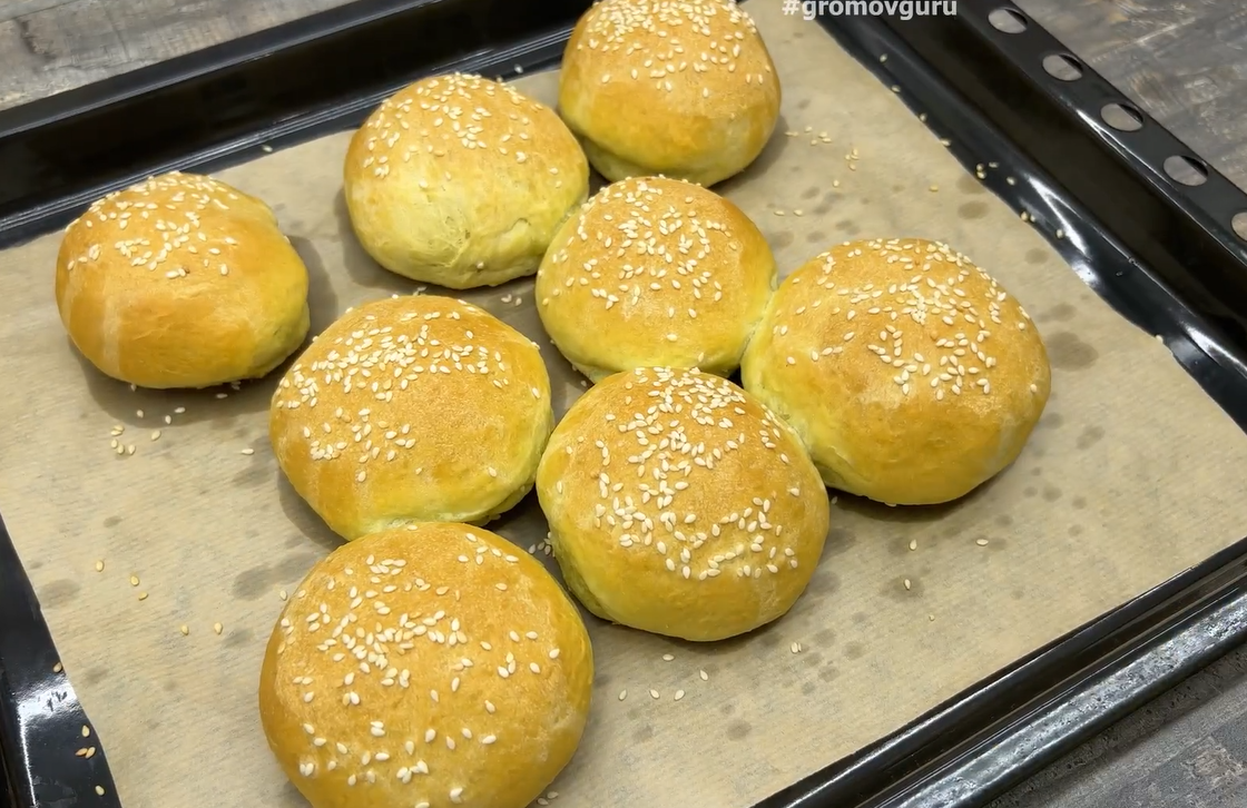 Подошедшее тесто обомните, разделите на равные части и сформируйте круглые булочки. Выложите их на противень, застеленный пергаментом, и, по желанию, посыпьте кунжутом. Накройте и оставьте на 20 минут для финальной расстойки.