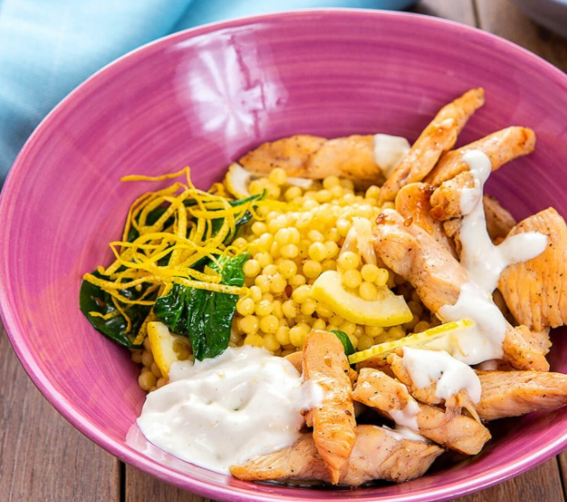 Куриные ломтики, обжаренные в приправе заатар, с пряным птитимом и лимонным соусом