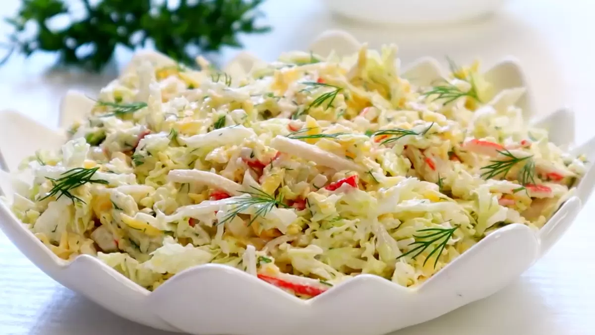В этом салате основным ингредиентом выступает нежная пекинская капуста, придающая блюду свежесть и легкость. Яркие вкрапления других компонентов делают его не только привлекательным, но и вкусным. Приготовление таком салата займет не более пяти минут!