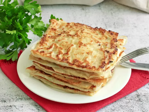 Для этого рецепта рекомендуется использовать большой и тонкий лаваш. Разрезав лаваш на прямоугольные полоски, его можно легко свернуть в квадраты с начинкой.