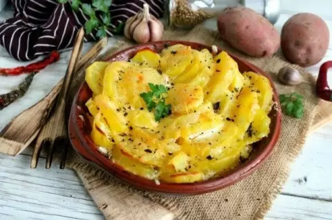 Спустя 25 минут, аккуратно снимаем фольгу и присыпаем картошку натертым сыром. Затем возвращаем блюдо в духовку еще на 10 минут, чтобы добиться золотистой корочки.