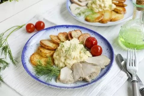 Чтобы скрэмбл получился особенно воздушным, яйца стоит хорошо взбить заранее. Для баланса вкусов маринованные помидоры добавят нужную кислотность, а сливочное масло придаст кремовую насыщенность. Подача: выложить картофель как основу, сверху аккуратно разместить скрэмбл и филе индейки, украсить целыми помидорами.