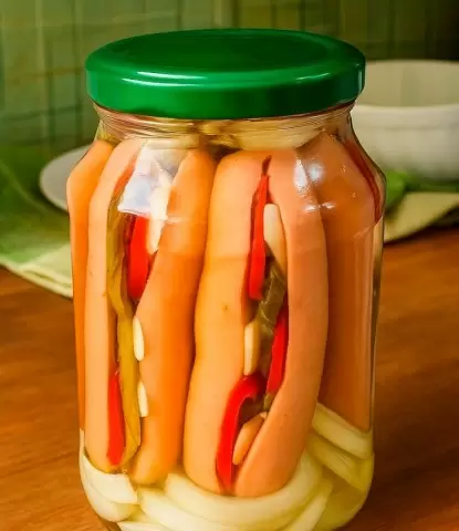 1. Начинается всё с подготовки ингредиентов. Чеснок очищается и нарезается тонкими пластинками, маринованные огурцы и острый перец нарезаются кружочками, а лук — кольцами. Сардельки освобождаются от шкурки.