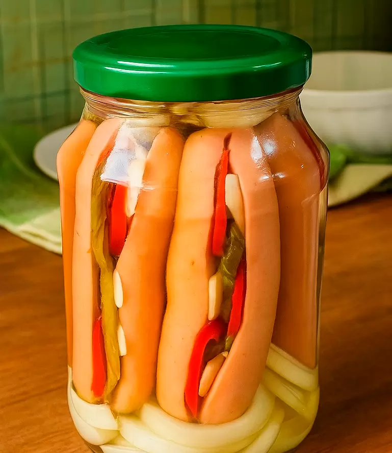 2. Следующий шаг — создание "кармашков" в сарделях. Вдоль каждой сардельки делается надрез, чтобы можно было заполнить их кружочками огурцов, острого перца, чеснока и луком.