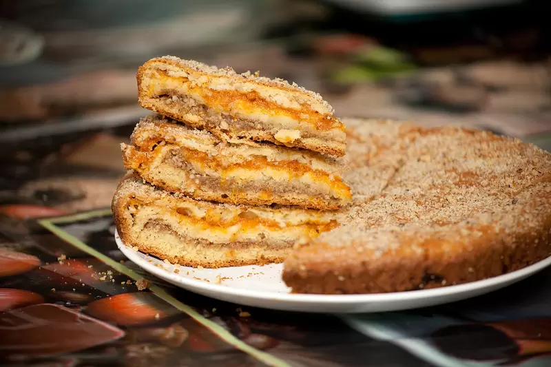 Этот пирог с орехами и курагой – традиционное угощение дагестанской кухни. Для его приготовления нужно замесить тесто из яйца, сахара и сметаны с добавлением соды и сливочного масла. Тесто оставляют на ночь для лучшего подъема. Начинка готовится из орехов и кураги, которые пропускаются через мясорубку вместе с сахаром. В процессе сборки пирога слои теста чередуются с начинкой. Выпекать следует при 200 градусах около 25 минут.