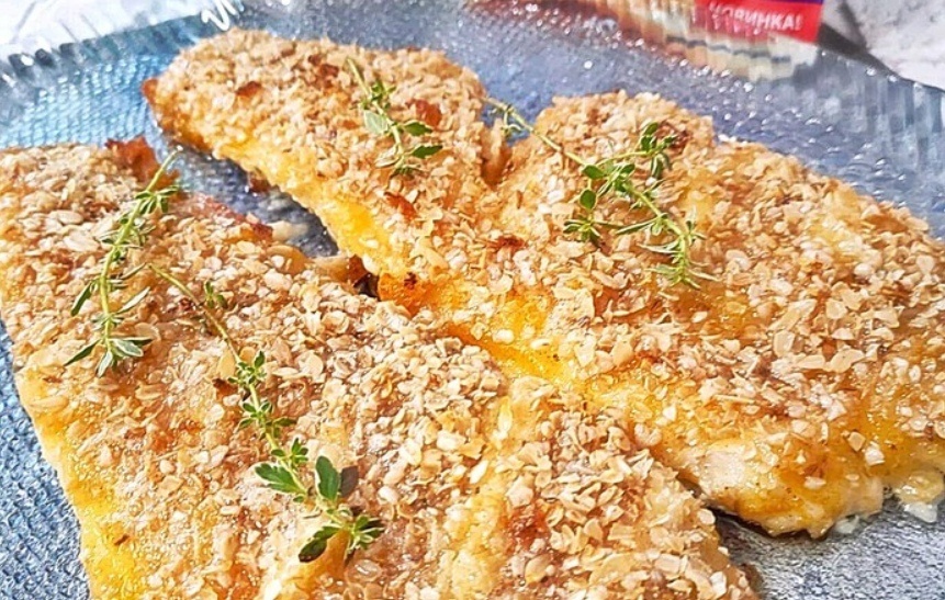 Теперь в тесто добавляется натёртый сыр. Растопленное масло выливается в форму для запекания. Рыба обваливается в приготовленной темпуре и укладывается на противень. Сверху посыпается овсяными хлопьями и поливается растопленным маслом. Всё это помещается в предварительно разогретую до 200 градусов духовку и запекается около 30 минут. После завершения процесса запекания форма накрывается фольгой и оставляется ещё на 10 минут.