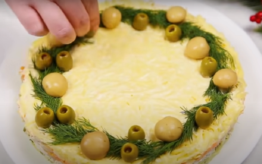 Веточки укропа создадут эффект елового венка, а маринованные грибы и оливки добавят визуальной привлекательности, словно «игрушки на елке». Приготовленный таким образом салат можно адаптировать под любые праздники, меняя украшение в зависимости от повода.