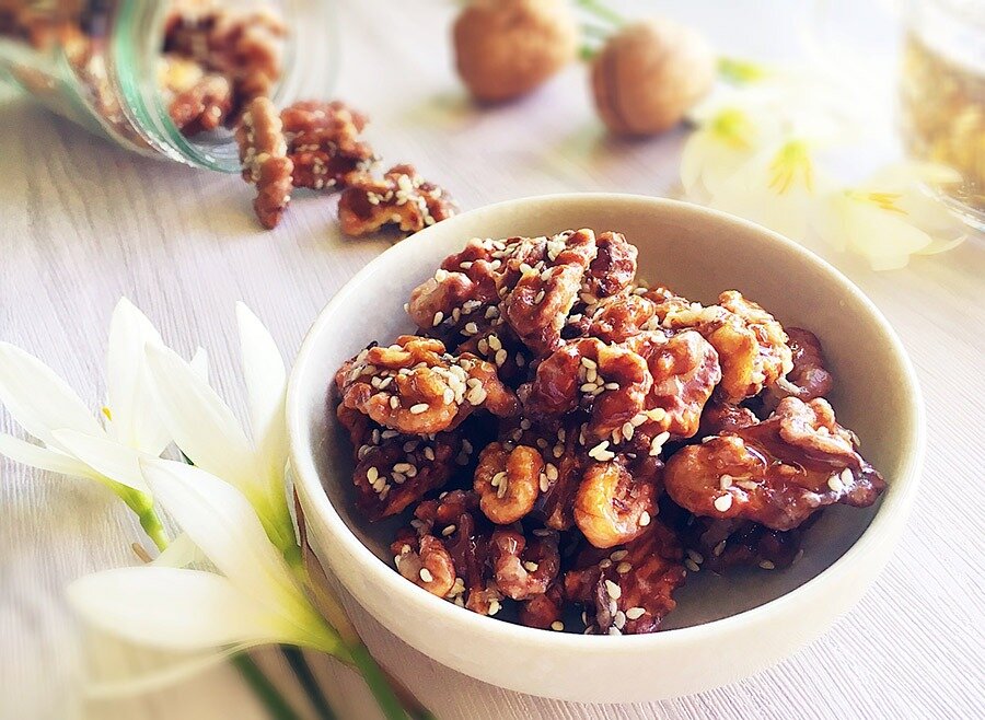 Грецкие орехи стоит предварительно промыть и разместить на противне. Затем отправляем их в разогретую до 160°C духовку на 15 минут, чтобы они стали более ароматными.На небольшой сковороде на медленном огне смешайте сахар с водой. Ждите, пока смесь закипит и сахар растворится, затем она приобретет золотистый оттенок. Добавьте в сковороду орехи, тщательно перемешивая их, чтобы каждый орех был покрыт сладким сиропом.В этот момент влейте мед и посыпьте орехи кунжутом, опять же хорошо перемешивая, чтобы добиться равномерного распределения ингредиентов. Выложите янтарные орехи на блюдо для подачи.Важно: данный десерт лучше всего подавать сразу же, как только он будет готов. Для этого на стол можно поставить миску с холодной водой и льдом. Окуная орешки в ледяную воду, их сладкая оболочка застывает, и тем самым создается невероятный хрустящий эффект при поедании.