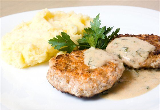 Для подачи шницеля важен и соус. Сделайте его из оставшегося молока и 5 г муки: прогрейте на слабом огне до загустения. Залейте готовые шницели соусом, поверхность присыпьте тертым сыром, а затем капните немного масла. Запекайте блюдо в духовке до появления аппетитной корочки.